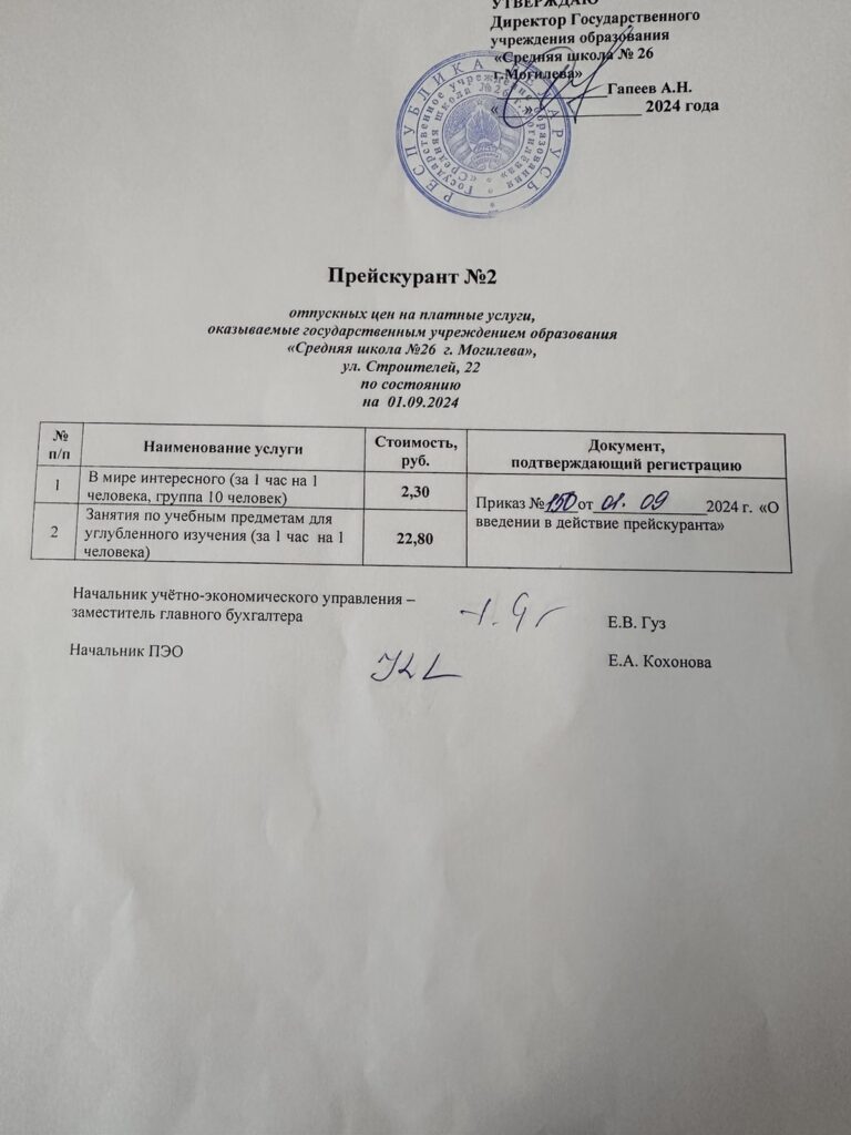 Прейскурантотпускных цен на платные образовательные услуги,оказываемые государственным учреждением образования «Средняя школа №26 г. Могилева», по состоянию на 01.09.2024 г.